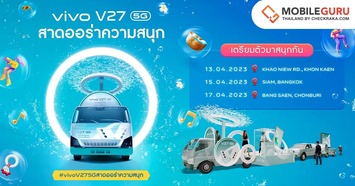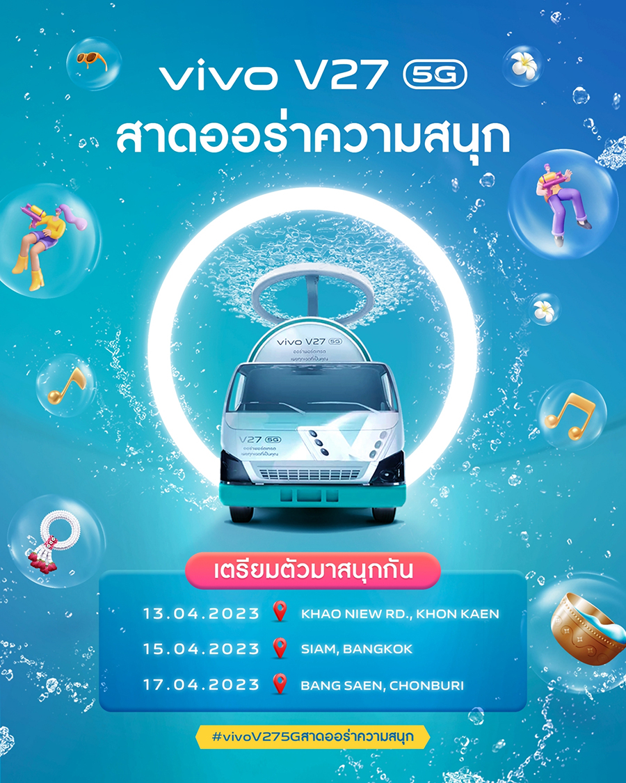 เตรียมพบกับขบวนคาราวาน vivo V27 5G ที่จะขนความมันส์ไปสาดทุกคนให้ชุ่มฉ่ำได้สัมผัสกับความสุขกันทั่วทั้งประเทศ สนุกสนานไปกับบูธดีเจเคลื่อนที่ และกิจกรรมท้าให้ลองถ่ายภาพพอร์ตเทรตด้วย vivo V27 5G ตลอดทั้งวันไม่ว่าจะเป็นช่วงเวลากลางวันหรือกลางคืน จะแสงไหนก็เอาอยู่ พร้อมโพสต์ภาพและติดแฮชแท็ก #vivoV275Gสาดออร่าความสนุก เพื่อลุ้นรับรางวัลใหญ่สุดเซอร์ไพรส์จาก vivo แล้วมาพบกันกับ 3 พื้นที่สงกรานต์สุดฮิตทั่วไทยจัดเต็ม 3 วัน ให้แฟนๆ ได้สัมผัสประสบการณ์กันอย่างใกล้ชิดตลอดช่วงเทศกาลปีใหม่ไทยในปีนี้