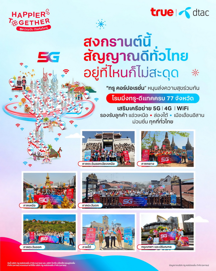 True Corporation เสริมทัพสัญญาณมื อถือ 5G 4G และ WiFi สุขยิ่งขึ้นรับสงกรานต์ ส่งสัญญาณดีทั่วไทย ใช้สัญญาณร่วมกัน ครอบคลุมยิ่งขึ้น เร็วแรงยิ่งขึ้น รองรับการใช้งานลูกค้าแบรนด์ทรู และดีแทคทั่วไทยช่ วงฉลองเทศกาลสงกรานต์ 2566 และวันหยุดยาวเพื่อเดินทางท่ องเที่ยว ไหว้พระทำบุญรับความสุขปีใหม่ ไทย พร้อมทั้งลูกหลานที่ทำงานต่างท้ องถิ่นจะได้เดินทางกลับภูมิ ลำเนาพบญาติผู้ใหญ่และอยู่พร้ อมหน้าพร้อมตาในครอบครัว รวมถึงสืบสานประเพณีรดน้ำดำหั วผู้ใหญ่เพื่อเป็นสิริมงคล