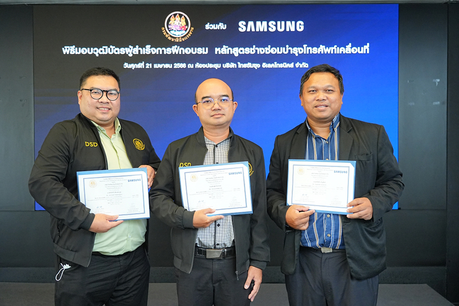 ซัมซุง ร่วมกับ กรมพัฒนาฝีมือแรงงาน กระทรวงแรงงาน นำโดย นายมาร์ค คิม ประธานองค์กร ธุรกิจโมบายล์ เอ็กซ์พีเรียนซ์ บริษัท ไทยซัมซุง อิเลคโทรนิคส์ จำกัด และนายพิเชษฐ์ ทองพันธ์ รองอธิบดีกรมพัฒนาฝีมือแรงงาน เดินหน้าส่งต่อองค์ความรู้ทั่วประเทศกับ "Samsung Tech Skill" จัดงานประกาศความสำเร็จโครงการพร้อมมอบใบประกาศนียบัตรให้กับผู้สำเร็จการฝึกอบรม หลักสูตรการซ่อมบำรุงโทรศัพท์เคลื่อนที่จำนวน 46 คน ย้ำแนวทางการดำเนินธุรกิจแบบยั่งยืนของซัมซุง "Everyday Sustainability"