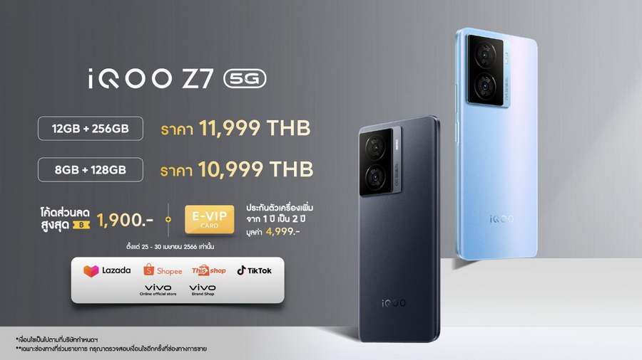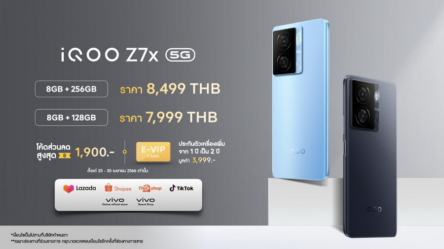 - มาพร้อม 2 รุ่นใหม่ iQOO Z7 5G ในราคาเริ่มต้น 10,999 บาท และ iQOO Z7x 5G ราคาเริ่มต้น 7,999 บาท