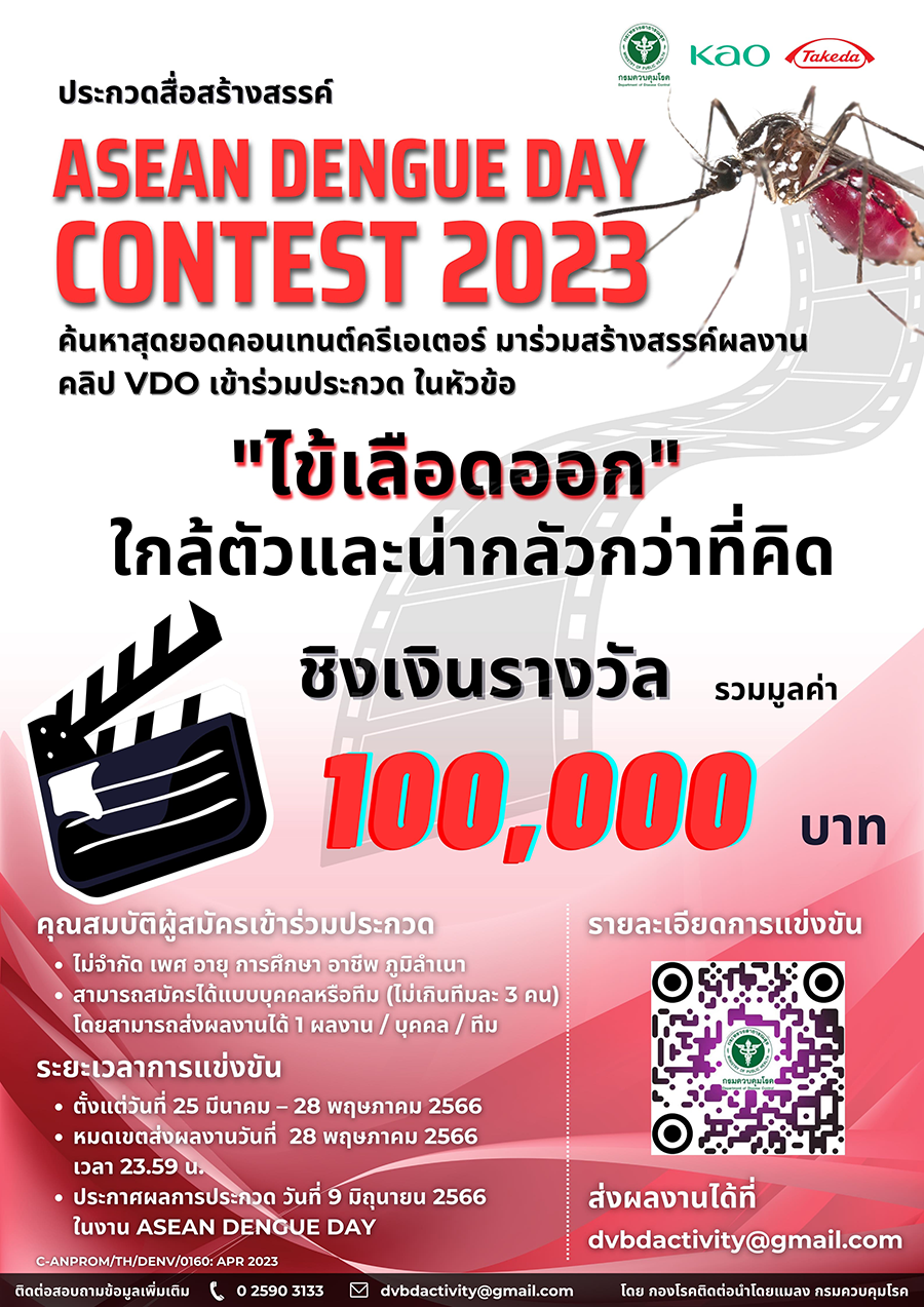 กองโรคติดต่อนำโดยแมลง กรมควมคุมโรค กระทรวงสาธารณสุข ร่วมกับ บริษัท คาโอ อินดัสเตรียล (ประเทศไทย) จำกัด และบริษัท ทาเคดา (ประเทศไทย) จำกัด ขอเชิญผู้สนใจ ส่งผลงานวิดีโอเข้าร่วมการประกวดสื่อสร้างสรรค์ "ASEAN DENGUE DAY CONTEST 2023" ในหัวข้อ "ไข้เลือดออกใกล้ตัวและน่ากลัวกว่าที่คิด" ชิงเงินรางวัลมูลค่ารวม 100,000 บาท พร้อมโล่ประกาศเกียรติคุณ