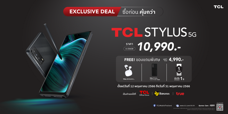 คุ้มยิ่งขึ้น! เมื่อซื้อผ่านผู้ให้บริการเครือข่าย TRUE ที่ร้าน TRUE SHOP ราคาเริ่มต้นเพียง 5,890 บาท และคุ้มอีก 3 ต่อ! กับโปรโมชัน EXCLUSIVE DEAL เมื่อซื้อ TCL STYLUS 5G ตั้งแต่วันที่ 12 พฤษภาคม 2566 ถึง 31 พฤษภาคม 2566 รับฟรี ของสมนาคุณถึง 3 อย่าง รวมมูลค่า 4,990 บาท ประกอบด้วย หูฟังไร้สาย TCL MOVEAUDIO Air มูลค่า 1,490 บาท, เคสมือถือ TCL STYLUS 5G Card Holder Case มูลค่า 450 บาท และประกันหน้าจอแตกนาน 1 ปี จำนวน 1 ครั้ง มูลค่า 3,050 บาท รีบเลย! ของแถมมีจำนวนจำกัด