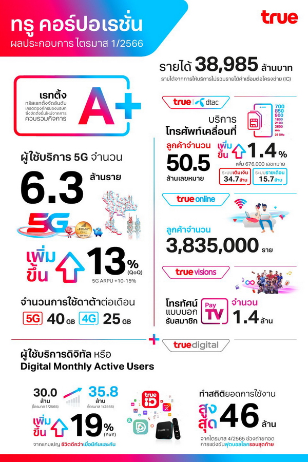 ในไตรมาสที่ 1 ปี 2566 ผู้ใช้บริการมือถือเพิ่มขึ้น 676,000 เลขหมาย ไปอยู่ที่ระดับ 50.5 ล้านเลขหมาย หรือเพิ่มขึ้น 1.4% จากไตรมาสที่ 4 ปี 2565 ผู้ใช้บริการ 5G มีจำนวนถึง 6.3 ล้านเลขหมาย เพิ่มขึ้น 13% เมื่อเทียบกับไตรมาสก่อน (QoQ) โดยมีปริมาณการใช้งานที่เพิ่มขึ้ น และ 5G มีรายได้เฉลี่ยต่อเลขหมายต่อเดื อน (ARPU) ที่เพิ่มขึ้น 10-15% ผู้ใช้งานดิจิทัลรายเดือน (MAU) สูงถึง 35.8 ล้านราย เพิ่มขึ้น 19% เมื่อเปรียบเทียบกับช่วงเดียวกั นของปีก่อน (YoY) ซึ่งได้แรงหนุนอย่างต่อเนื่ องจากแคมเปญชีวิตดีกว่า เมื่อมีกันและกัน หรือ Better Together หลังจากการควบรวมกิจการเสร็จสิ้ น ทั้งนี้ ในไตรมาสที่ 4 ปี 2565 ยอดผู้ใช้งานดิจิทัล (MAU) ทำสถิติสูงสุดเป็นประวัติการณ์ ถึง 46.0 ล้านราย จากการถ่ายทอดรายการแข่งขันฟุ ตบอลโลกรอบสุดท้าย (FIFA World Cup Final 2022)