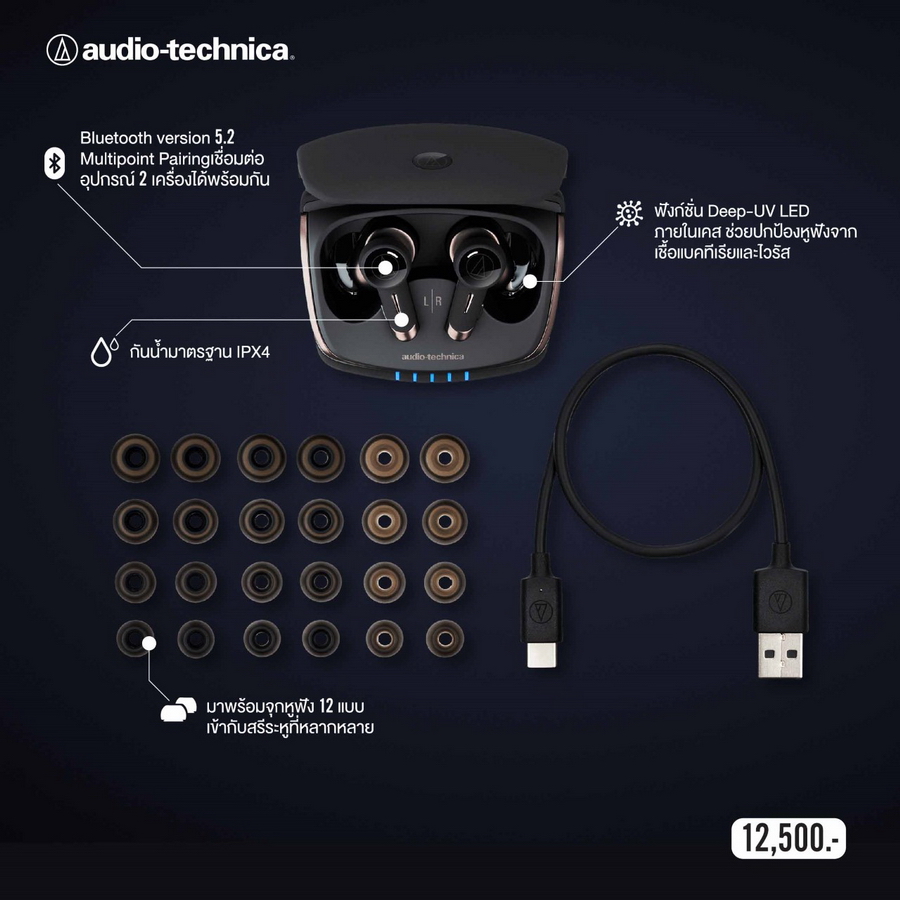 นอกจากนี้ ATH-TWX9 ยังออกแบบมาให้คุณสวมใส่ได้อย่างกระชับ สบายหู ด้วยจุกหูฟังที่มาพร้อมโครงสร้างที่ผสมผสานกันระหว่างซิลิโคนแบบแข็งและนิ่ม เพื่อช่วยให้คุณได้ยินเสียงที่มีคุณภาพสูงสุด โดยมีความยาวให้เลือกถึง 4 ขนาดในแต่ละไซส์ (XS/S/M/L) หมดห่วงเรื่องการใช้งานด้วยมาตรฐานกันน้ำกันเหงื่อระดับ IPX4 ทั้งยังให้คุณสนทนาได้อย่างคมชัด ไม่มีสะดุด ด้วยไมโครโฟนแบบ MEMS ที่รวม 2 เทคโนโลยีสุดล้ำเข้าไว้ด้วยกัน คือ Beamforming และ Qualcomm® cVc™ Generation 8.0 ช่วยให้คุณไม่พลาดทุกการสื่อสาร รวมถึงแบตเตอรี่ที่สามารถใช้งานได้นานสูงสุด 6 ชม. และเพิ่มเป็น 12.5 ชม.เมื่อใช้ร่วมกับตลับชาร์จ (รวมเป็นสูงสุด 18.5 ชม.) พร้อมระบบฆ่าเชื้อโรคโดยใช้ Deep-UV LED ที่มาพร้อมตลับชาร์จช่วยขจัดแบคทีเรียและไวรัสที่อยู่ภายนอกตัวหูฟังได้อย่างดีเยี่ยม ยิ่งไปกว่านั้นยังสามารถควบคุมการใช้งานโหมดต่างๆได้อย่างง่ายดายผ่านแอปพลิเคชัน Audio-Technica Connect อาทิ ตั้งค่า Low Latency, ปรับแต่งระบบตัดเสียงรบกวน, ปรับและบันทึก EQ, ปรับระดับเสียงซ้าย/ขวา, อีกทั้งยังสามารถเลือกการสั่งงานด้วยเสียงผ่าน Amazon Alexa หรือ Google Assistant และอื่นๆอีกมากมาย พร้อมวางจำหน่ายในราคา 12,500 บาท