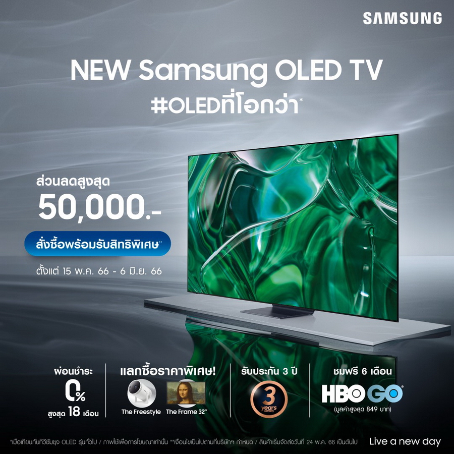 ซัมซุงมอบทางเลือกให้ผู้บริโภคตลาดทีวีพรีเมียมมากขึ้นด้วยการสัมผัสประสบการณ์การรับชมแบบ #OLEDที่โอกว่ากับ New Samsung OLED TV พบโปรโมชั่นพิเศษ Early Order ตั้งแต่วันที่ 15 พฤษภาคม – 6 มิถุนายน 2566 เท่านั้น ทาง www.samsung.com/th และร้านค้าชั้นนำทั่วประเทศ
