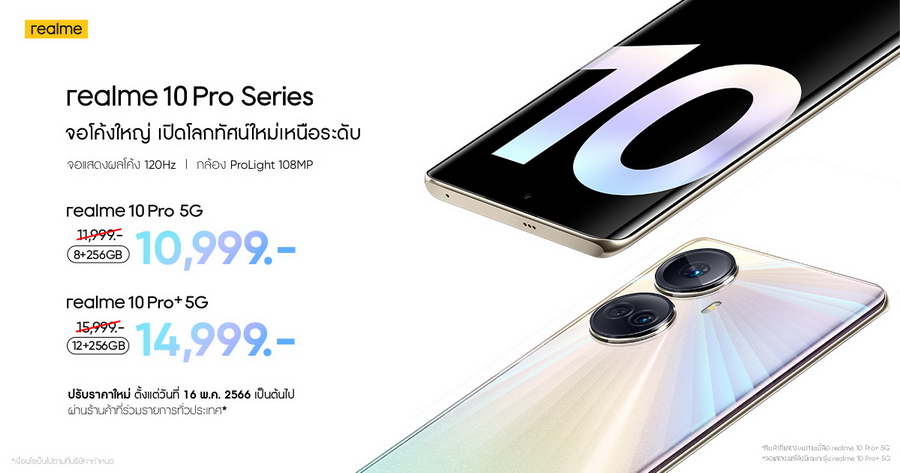ใครกำลังมองหามือถือสเปกแรงแต่ ราคาไม่แพง ห้ามพลาด! เพราะวันนี้ realme แบรนด์สมาร์ตโฟนเพื่อคนรุ่นใหม่ ที่เติบโตเร็วที่สุดในโลก ประกาศปรับราคาสมาร์ตโฟน realme 10 Pro Series ให้คุณเป็นเจ้าของได้แบบคุ้มค่ ามากกว่าเดิม โดย realme 10 Pro ความจุ 8/256GB ปรับลดจาก 11,999 เหลือเพียง 10,999 บาท และ realme 10 Pro+ 5G ความจุ 12/256GB ปรับลดจาก 15,999 เหลือเพียง 14,999 บาท