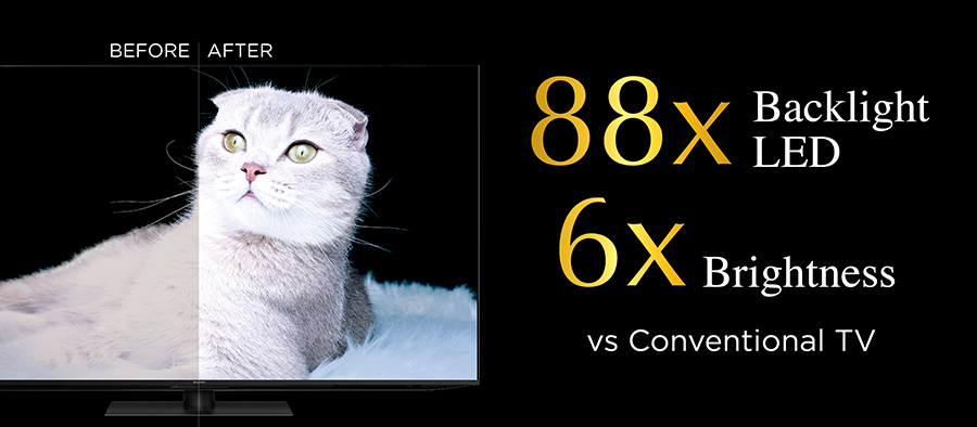 ในทีวี SHARP AQUOS XLED 4K มีเทคโนโลยี Xtreme mini-LED ซึ่งนำเสนอโซนลดแสงสูงสุดในระดับเดียวกันเพื่อความสว่างที่แท้จริง ด้วยแบ็คไลท์ 2,000 โซน ให้ภาพคอนทราสต์ของสีแบบไดนามิกที่เหนือชั้นซึ่งทำให้แตกต่างจากแบรนด์อื่นๆ ในตลาด ยิ่งไปกว่านั้น ไฟ LED แบ็คไลท์ที่เพิ่มขึ้นอย่างมากถึง 88 เท่า* ให้ความสว่างสูงสุด 6 เท่า* เมื่อเทียบกับจอแสดงผลทั่วไป ทำให้ได้จอแสดงผลที่สวยงามตระการตา