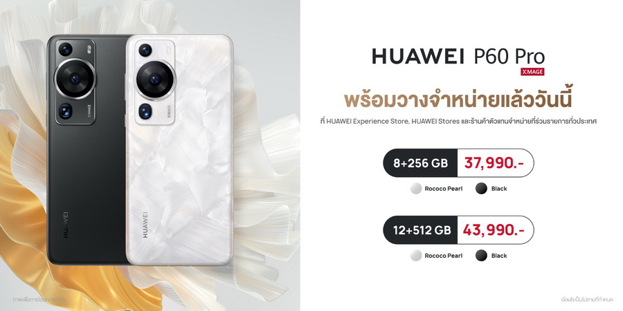 HUAWEI P60 Pro วางจำหน่ายด้วยกัน 2 สี ได้แก่ สีขาวไข่มุก Rococo Pearl และสีดำ สำหรับหน่วยความจำ 8+256 GB วางจำหน่ายในราคา 37,990 บาท และสำหรับหน่วยความจำ 12+512 GB วางจำหน่ายในราคา 43,990 บาท สั่งซื้อสินค้าที่หน้าร้าน HUAWEI Experience Store และร้านค้าที่ร่วมรายการ รวมถึงช่องทางออนไลน์อย่าง HUAWEI Store และร้านค้าอย่างเป็นทางการของหัวเว่ยบน Shopee, Lazada และแอปพลิเคชัน My HUAWEI