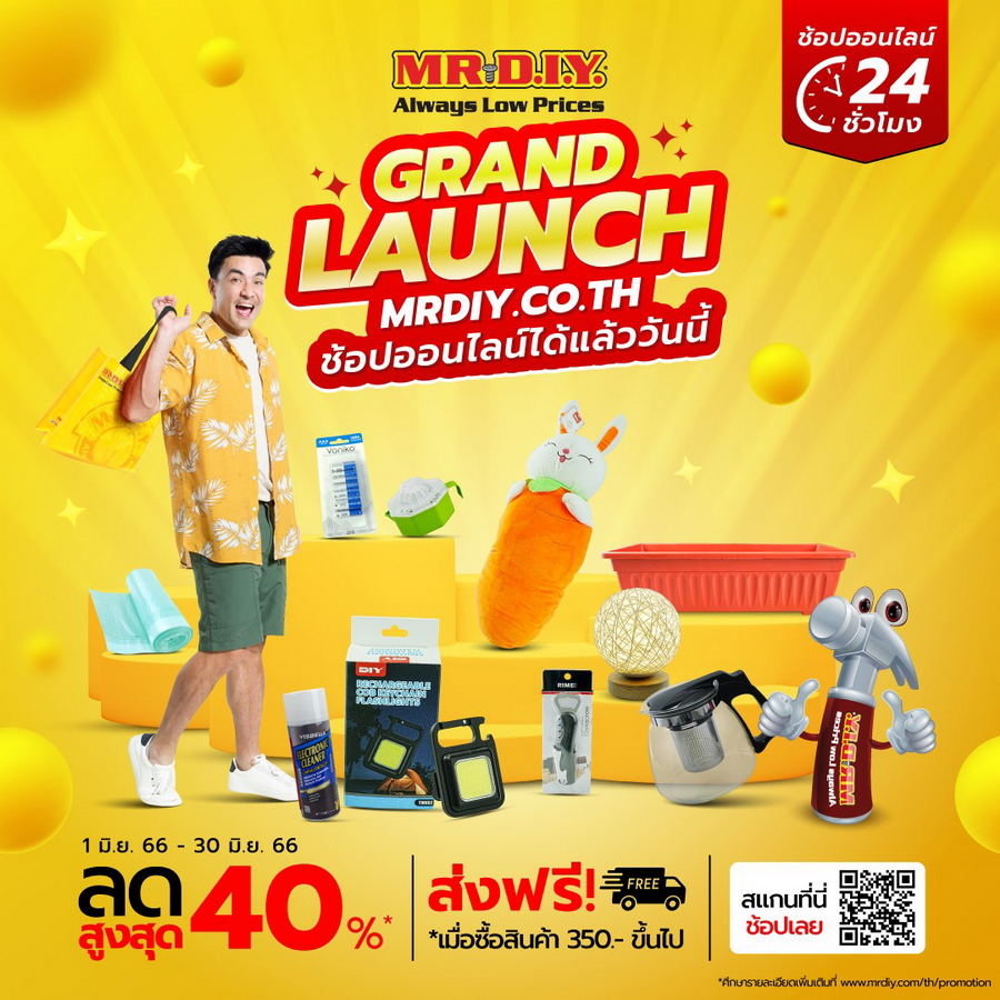 WWW.MRDIY.CO.TH ร้านค้าออนไลน์อย่างเป็นทางการครั้งแรกในประเทศไทย เสริมแกร่งกลยุทธ์การตลาดออนไลน์ ขยายช่องทางเพิ่มความสะดวกสบายแก่ลูกค้าทั่วประเทศ ชูสินค้าขายดี เติมเต็มทุกความต้องการและทุกไลฟ์สไตล์ของผู้บริโภคยุคใหม่ ตอกย้ำ ‘ช้อปได้ทุกวัน ครบเพื่อทุกคน’ เน้นสั่งซื้อสินค้า ง่าย สะดวก รวดเร็ว และปลอดภัย พร้อมโปรโมชันเปิดตัวพิเศษ ‘Grand Launch’ ตลอดเดือนมิถุนายน 2566