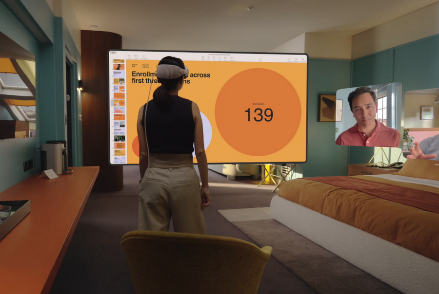 จอแสดงผล micro OLED แต่ละข้างมีความละเอียดสูงถึง 23MP ซึ่งสูงกว่าความละเอียด 4K ในแต่ละข้างเลยละครับ และใช้เลนส์ ZEISS ส่วนชิปจะเป็น Apple M2 มาพร้อมกล้อง 12 ตัว และเซ็นเซอร์ 5 ตัว พร้อมไมโครโฟน 6 ตัว สตรีมภาพไปยังหน้าจอภายใน 12 มิลลิวินาที ซึ่งเร็วกว่าการกะพริบตาถึง 8 เท่า