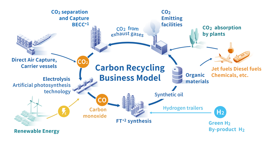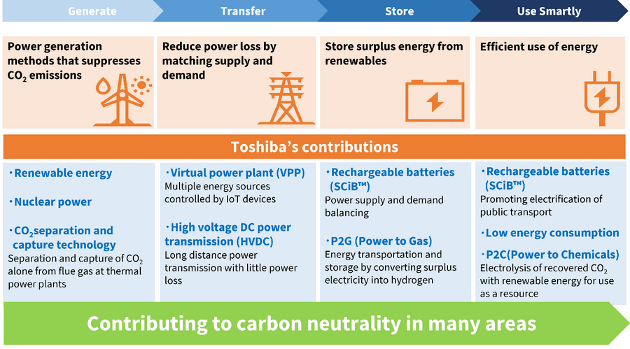 | - พลังงานหมุนเวียน - พลังงานนิวเคลียร์ - เทคโนโลยีการแยก และการดักจับคาร์บอนไดออกไซด์ การแยกและการดักจับคาร์บอนไดออกไซด์จากก๊าซที่ปล่องควันในโรงไฟฟ้าพลังงานความร้อน | - โรงไฟฟ้าเสมือน (Virtual power plant: VPP) แหล่งพลังงานหลายแหล่ง ควบคุมด้วยอุปกรณ์ IoT - การส่งไฟฟ้าแรงสูงกระแสตรง (High voltage DC power transmission: HVDC) การส่งพลังงานระยะไกลโดยสูญเสียพลังงานเพียงเล็กน้อย | - แบตเตอรี่แบบชาร์จไฟซ้ำได้ (SCiB™) ระบบสมดุลอุปสงค์และอุปทานพลังงาน - การแปลงพลังงานไฟฟ้าเป็นก๊าซ (Power to gas: P2G) การขนส่งและการ กักเก็บพลังงานโดยแปลงไฟฟ้าส่วนเกินเป็นไฮโดรเจน | - แบตเตอรี่แบบชาร์จไฟซ้ำได้ (SCiB™) ส่งเสริมการเปลี่ยนระบบขนส่งสาธารณะให้ใช้พลังงานไฟฟ้า - การใช้พลังงานต่ำ - การแปลงพลังงานไฟฟ้าเป็นพลังงานเคมี (Power to chemicals: P2C) การแยกสลายคาร์บอนไดออกไซด์ที่นำกลับมาใช้ใหม่ด้วยพลังงานหมุนเวียนเพื่อใช้เป็นทรัพยากร |