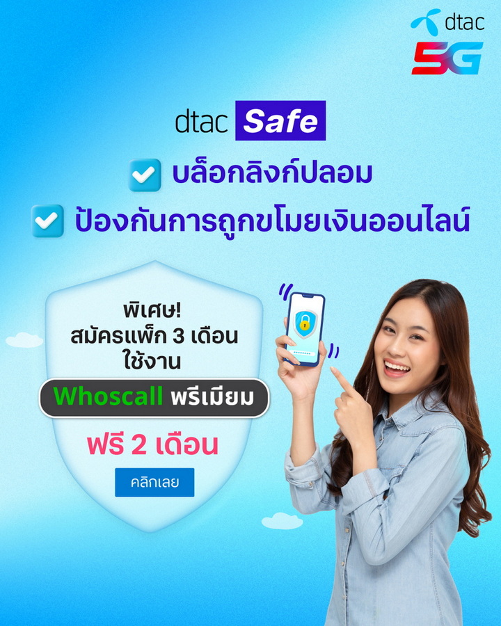 - สำหรับลูกค้า Whoscall ที่ใช้เครือข่ายดีแทค สมัคร dtac Safe วันนี้ ได้ใช้ฟรี 2 เดือน มูลค่า 58 บาท วันนี้ถึง 31 ธ.ค. 66