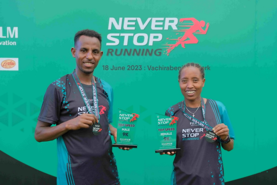 ด้าน นายเอบิซา ทาเคเล่ ผู้ชนะรางวัล Top Speed ระยะทาง 9 กิโลเมตร ประเภทชาย กล่าวว่า “ดีใจและเป็นเกียรติมาก ๆ ที่ได้รับรางวัล Top Speed จากงาน FUJIFILM NEVER STOP Running 2023 นอกจากจะได้เอาชนะใจตัวเองแล้วยังได้มีโอกาสสนับสนุนมูลนิธิดี ๆ เพื่อสังคมที่ช่วยดูแลสุขภาพของคนในพื้นที่ห่างไกลอีกด้วย ขอขอบคุณฟูจิฟิล์ม ที่จัดงานวิ่งการกุศลที่ช่วยขับเคลื่อนสังคมได้เป็นรูปธรรมเช่นนี้”