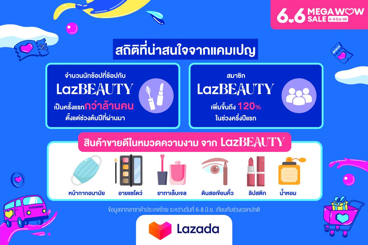 ในขณะที่หมวดสินค้าความงามจาก LazBEAUTY ได้รับความนิยมจากนักช้อปไม่แพ้กัน โดยฐานลูกค้าของ LazBEAUTY เติบโตขึ้นอย่างสม่ำเสมอ เห็นได้จากนักช้อปสาว ๆ หน้าใหม่ที่ช้อปกับ LazBEAUTY เป็นครั้งแรกรวมเป็นจำนวนหลักล้านคนตั้งแต่ช่วงต้นปีที่ผ่านมา อีกทั้งยังมีผู้ที่ชื่นชอบและติดตามเทรนด์บิวตี้ สมัครเป็นสมาชิก LazBEAUTY เพิ่มขึ้นถึง 120% ในช่วงครึ่งปีแรก