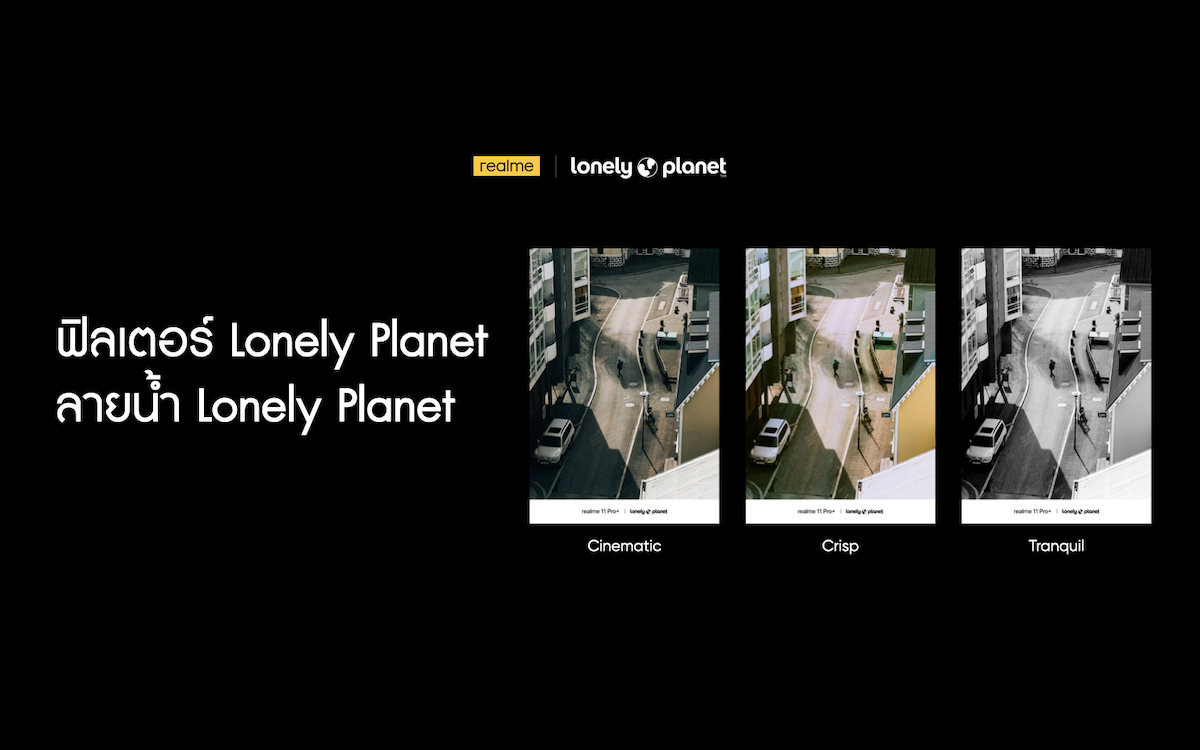 และเพื่อตอกย้ำว่า realme 11 Pro Series 5G เป็นสมาร์ตโฟนที่เหมาะสำหรับการท่องเที่ยวอย่างแท้จริง จึงได้ยกระดับการถ่ายภาพโดยเรียลมีได้ร่วมมือกับพาร์ทเนอร์ Lonely Planet นิตยสารคู่มือสำหรับนักเดินทางชื่อดัง โดยสามารถแต่งภาพด้วยลายน้ำจาก Lonely Planet และฟิลเตอร์หลากรูปแบบ (Cinematic, Crisp และ Tranquil) สร้างสรรค์ภาพถ่ายตามจินตนาการได้อย่างง่ายดายในขั้นตอนเดียว นอกจากนี้ กล้องถ่ายภาพของทั้ง 2 รุ่นยังใช้สถาปัตยกรรม HyperShot Imaging 2.0 ช่วยเพิ่มคุณภาพของภาพถ่ายทั้งในเรื่องความคมชัดและสีสัน ซึ่งเมื่อทำงานร่วมกับโหมดการถ่ายภาพเจนใหม่อย่าง Street Photography Mode 4.0 จะทำให้คุณสนุกกับการถ่ายภาพในทุก ๆ ไลฟ์สไตล์