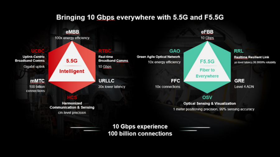 หัวเว่ย นำเสนอแนวคิด “5.5G Era” ซึ่งประกอบด้วยโซลูชันแบบครบชุด อันเกิดจากการบูรณาการเทคโนโลยีแบบครบสูตร ประกอบด้วยเทคโนโฃยี 5.5G, F5.5G, และ Net5.5G โดยเครือข่าย 5.5G จะรองรับความเร็วดาวน์ลิงก์ระดับสูงสุดที่ 10 กิกะบิต และอัพลิงค์ระดับสูงสุดที่ 1 กิกะบิต รองรับการเชื่อมต่อ 1 แสนล้านครั้ง ขณะเดียวกันเครือข่ายยังมีความอัจฉริยะที่จะช่วยยกระดับอุตสาหกรรม 5G และผู้ประกอบการเครือข่ายขึ้นสู่ระดับใหม่ ทั้งนี้ ด้วยอัตราความหน่วงในการรับส่งข้อมูลต่ำ (low latency) ประกอบกับความเร็วดาวน์ลิงก์ 10 กิกะบิต และอัปลิงก์ 1 กิกะบิต ช่วยให้ผู้บริโภคได้รับประสบการณ์ที่สมจริงมากยิ่งขึ้นจากบริการ เช่น XR Pro การแสดงผลแบบโฮโลแกรม และวีดีโอภาพ 3 มิติ เป็นต้น นอกจากนี้ ยังมี 50G PON ซึ่งเป็นอีกหนึ่งเทคโนโลยีหลัก ที่สามารถรองรับความเร็วระดับ 10 กิกะบิตสำหรับเครือข่ายบรอดแบนด์ F5.5G และคาดว่าจะมีการใช้งานอย่างแพร่หลายตามบ้าน สำนักงาน และภาคการผลิตต่าง ๆ นอกเหนือจากการพัฒนาเทคโนโลยีหลัก สำหรับเครือข่ายแบบไร้สายและออปติคอลสำหรับ 5.5G แล้ว หยาง เปิดเผยว่า Net5.5G จะถูกวางสถานะให้เป็นเครือข่ายพื้นฐานรุ่นใหม่สำหรับการเปลี่ยนผ่านสู่ยุคดิจิทัลของภาคอุตสาหกรรมต่าง ๆ