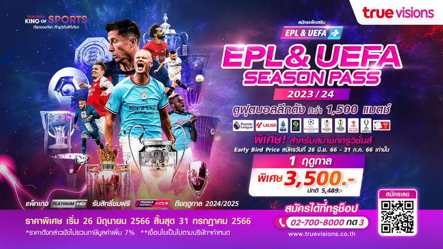 ทรูวิชั่นส์ ผู้นำคอนเทนต์กีฬาระดับโลก ตอกย้ำความเป็น KING OF SPORTS ประกาศคว้าลิขสิทธ์พรีเมียร์ลีก ฟุตบอลลีกอันดับ 1 ของโลก ส่งตรงการถ่ายทอดสดครบ 380 แมตช์ตลอดฤดูกาลแบบเอ็กซ์คลูซีฟแต่เพียงผู้เดียว พร้อมชวนลูกค้าและแฟนบอลชาวไทยเปิดประสบการณ์การรับชมแบบจัดเต็ม ไม่พลาดทุกช็อตสำคัญ ทุกวินาทีด้วยภาพและเสียงคมชัดระดับเอชดี สัญญาณเสถียรกว่า เสมือนชมพร้อมคนอังกฤษ เต็มอรรถรสกับทีมพากย์คุณภาพที่เป็นเอกลักษณ์ของทรูวิชั่นส์ พิเศษสุด! สำหรับลูกค้าแฟนพันธ์แท้ฟุตบอล สามารถสมัครแพ็กเกจสุดคุ้ม “EPL SEASON PASS 2023/24” EARLY BIRD เพียง 2,710 บาท (จากปกติ 3,990 บาท) และมันส์กันต่อเนื่อง แบบคุ้มยิ่งกว่า ให้เหล่าคอบอลสามารถชมพรีเมียร์ลีก และ ยูฟ่า แชมเปียนส์ลีก รวมฟุตบอลลีกดัง กว่า 1,500 แมตช์ตลอดฤดูกาล ในแพ็กเกจสุดพิเศษ “EPL&UEFA SEASON PASS 2023/24” EARLY BIRD เพียง 3,500 บาท (จากปกติ 5,489 บาท) เฉพาะสมาชิกทรูวิชั่นส์แบบรายเดือน เหมาจ่ายตลอดฤดูกาล