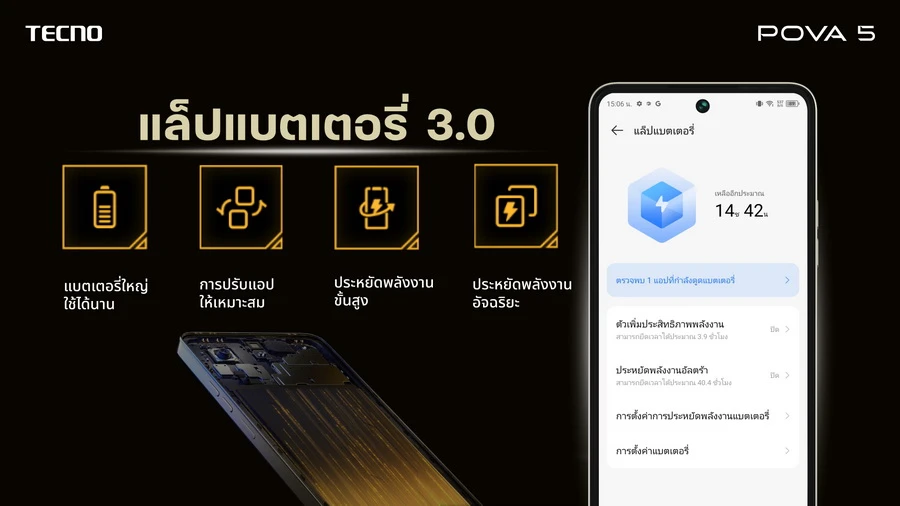 ยืดอายุการใช้งานแบตเตอรี่ให้สูงสุดด้วยหมัดฮุคของ POVA! เปิดใช้งานโหมดการประหยัดพลังงานขั้นสูงในเมนู แล็ปแบตเตอรี่ 3.0 เพื่อยืดเวลาสแตนด์บาย แสดงสถานะว่าแอปไหนคือตัวการที่กำลังกินแบตเตอรี่อยู่ โดยระบบบริหารพลังงานอัจฉริยะที่จะเป็นเหมือนผู้ช่วยจัดสรรการใช้พลังงานสำหรับสถานการณ์การใช้งานที่แตกต่างกัน