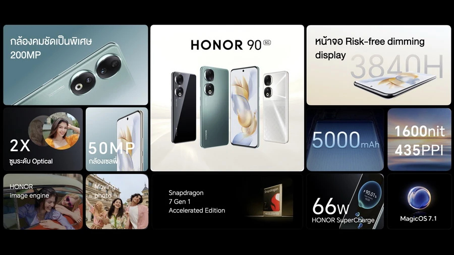 พร้อมลุยเจาะตลาด New Gen ด้วยกล้องหลัก 200 ล้านพิกเซล กล้องหน้า 50 ล้านพิกเซล เสริมด้วยเทคโนโลยี HONOR Image Engine ให้ภาพถ่ายในยามค่ำคืนสวยโดดเด่น พร้อมฟีเจอร์ AI Portrait เนรมิตภาพ Portrait สวยสมจริงเป็นธรรมชาติ อีกทั้งยังมีเทคโนโลยี PWM Dimming 3840Hz ซึ่งสามารถลดอัตราการกะพริบและลดแสงของหน้าจอที่มีประสิทธิภาพสูงสุดในตลาดสมาร์ทโฟนระดับเดียวกันในชั่วโมงนี้ โดย HONOR 90 5G เปิดตัวในราคาคุ้มค่าด้วยฟีเจอร์ระดับท็อปเพียง 13,990 บาท และ HONOR 90 Lite 5G เพียง 7,999 บาท พร้อมวางจำหน่ายตั้งแต่วันที่ 2 กันยายนนี้ นอกจากนี้ ภายในงานยังมีเปิดตัว HONOR Watch 4 มูลค่า 4,990 บาท และ HONOR Earbuds X5 มูลค่า 1,290 บาท อีกด้วย