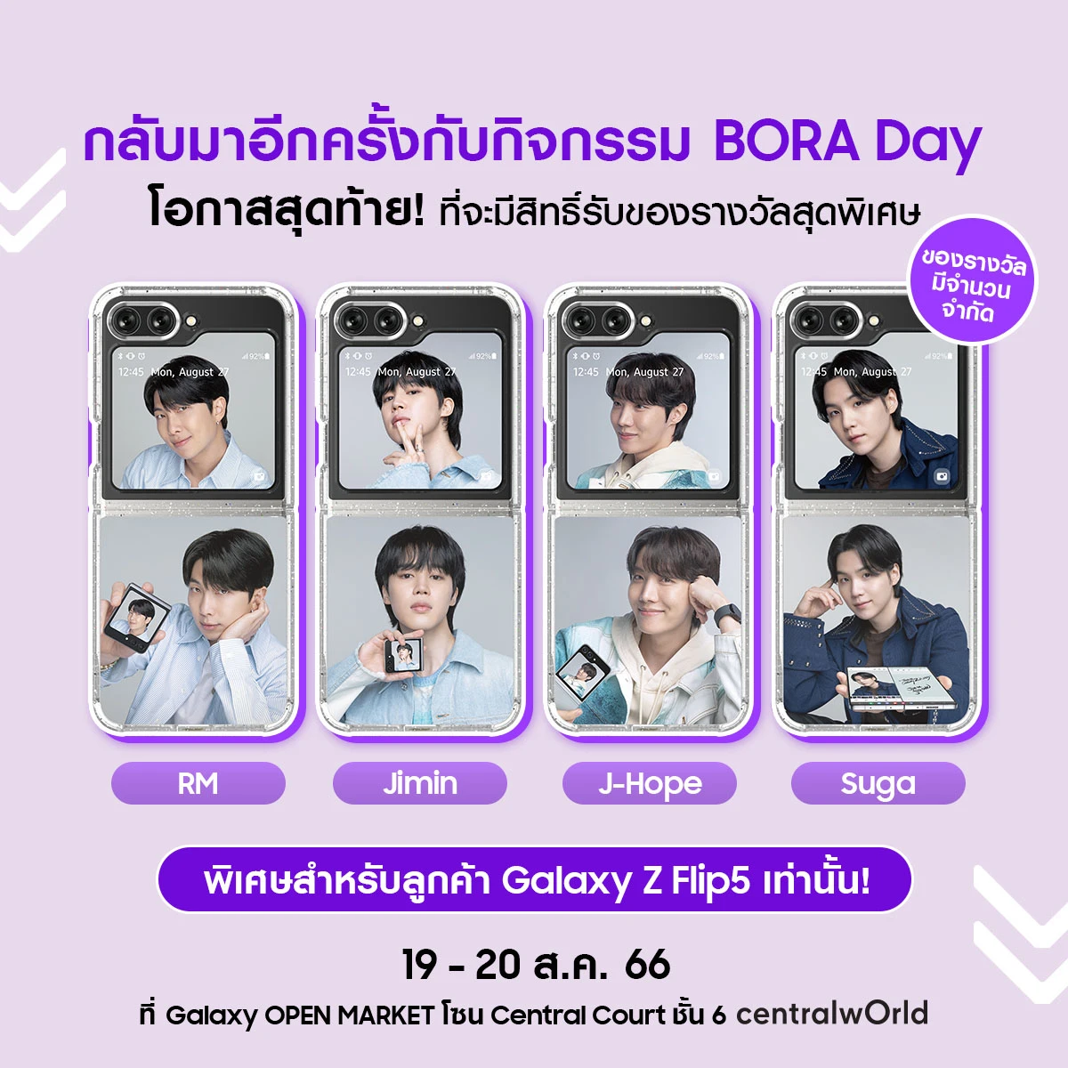 และจากเสียงตอบรับที่ดีสุดๆ ของ Bora Day ที่ผ่านมา ซัมซุงได้จัดกิจกรรม Bora Day อีกครั้งเอาใจแฟนคลับ BTS ที่มีเครื่อง Galaxy Z Flip5 ในวันที่ 19-20 สิงหาคม ร่วมเล่นกิจกรรมเพื่อลุ้นรับรางวัลสุดเอ็กคลูซีฟจาก BTS