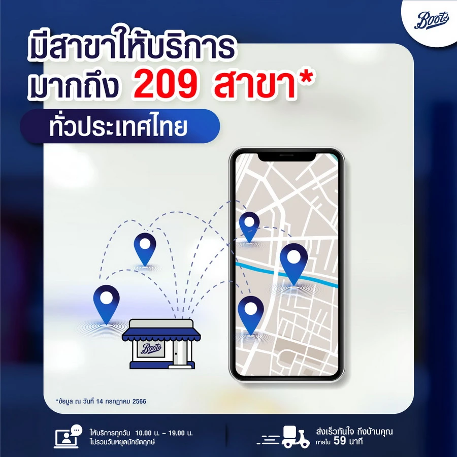 - ครอบคลุมพื้นที่ให้บริการมากถึง 209 สาขา ทั้งในกรุงเทพฯ ปริมณฑล และต่างจังหวัด* กับบริการเดลิเวอรี่จัดส่งยาสามัญประจำบ้าน วิตามิน อาหารเสริม เวชสำอาง หรือสินค้าสุขภาพความงามกว่า 6,000 รายการ อุ่นใจว่าจะได้รับผลิตภัณฑ์คุณภาพที่ได้มาตรฐานส่งตรงจากบู๊ทส์