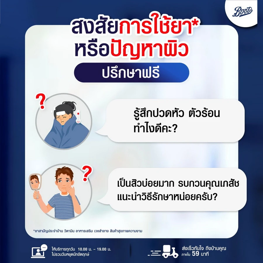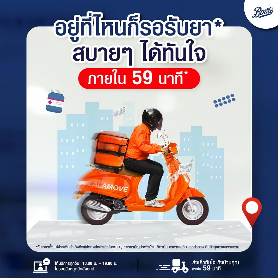 - ส่งแบบรวดเร็วทันใจ อยู่ที่ไหน ก็สามารถรอรับผลิตภัณฑ์สุขภาพจากบู๊ทส์ได้ทันใจภายใน 59 นาที