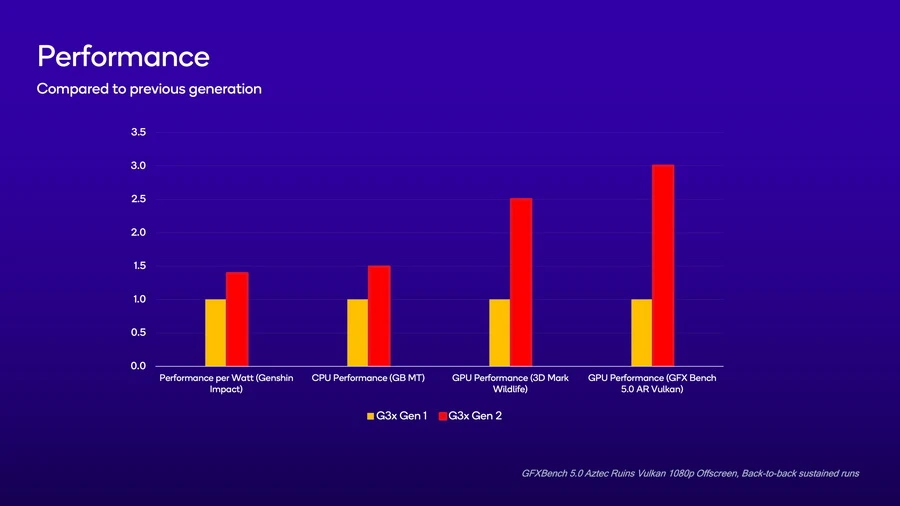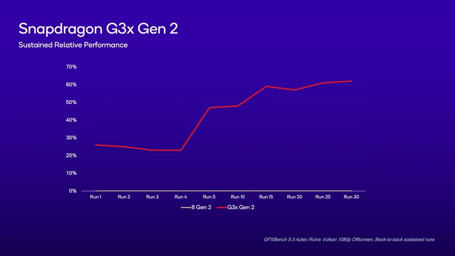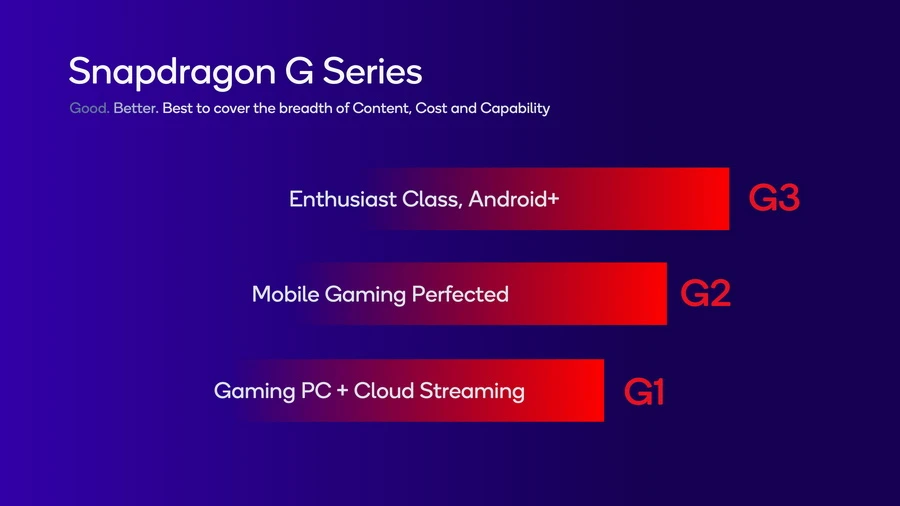 • Snapdragon G3 นับเป็นชิประดับเรือธงที่ออกแบบให้มีฟีเจอร์และประสิทธิภาพสูงสุด พัฒนาโดยใช้ประโยชน์จากความสามารถในด้านนวัตกรรมการเล่นเกมที่ดีที่สุดของ Qualcomm Technologies ด้วยการต่อยอดผลตอบรับที่น่าทึ่งจาก Razer Edge 5G ที่ขับเคลื่อนโดย Snapdragon G3x Gen 1 ทำให้อุปกรณ์ต่างๆที่ใช้ Snapdragon G3 สามารถมอบประสบการณ์การเล่นเกมที่ดีที่สุดในแวดวงเกมมิ่งอีโคซิสเต็ม แพลตฟอร์ม Snapdragon G3x Gen 2 เป็นผลิตภัณฑ์ใหม่ล่าสุดในซีรีส์ G3 โดยมีขุมพลังจาก Kryo CPU (8 Core) และ Adreno A32 GPU ที่ให้ประสิทธิภาพการประมวลผลเร็วขึ้นมากกว่า 30% และประสิทธิภาพการประมวลภาพเร็วขึ้น 2 เท่า เมื่อเทียบกับรุ่นก่อน[1] แพลตฟอร์มนี้ได้พัฒนาขึ้นจากการปรับปรุงประสิทธิภาพจากหลายรุ่นก่อนๆ อีกทั้งยังมีคุณสมบัติการเล่นเกมระดับพรีเมียม เช่น ฮาร์ดแวร์ที่เร่งการเรนเดอร์ภาพของแสงและเงา (Ray Tracing), มอบความละเอียดสูงสุด,การเชื่อมต่อ XR glass (XR glass tethering), เสียงบลูทูธ (Bluetooth®) ระดับพรีเมียมที่มีความหน่วงต่ำ จาก Snapdragon Sound™ Technology Suite และระบบไร้สายที่ตอบสนองไวที่สุดผ่าน Wi-Fi 7 High-Band Simultaneous (HBS) รวมถึง 5G sub-6 และ mmWave