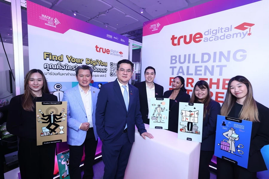 นายชัยวุฒิ ธนาคมานุสรณ์ รัฐมนตรีว่าการกระทรวงดิจิทัลเพื่อเศรษฐกิจและสังคม (ดีอีเอส) ร่วมด้วย ผศ.ดร.ณัฐพล นิมมานพัชรินทร์ ผู้อำนวยการใหญ่ สำนักงานส่งเสริมเศรษฐกิจดิจิทัล (ดีป้า) ชมศักยภาพระบบนิเวศดิจิทัลส่งเสริมการพัฒนาคนให้มีคุณภาพและมีทักษะดิจิทัล (Digital Talent) เพื่อขับเคลื่อนประเทศไทยสู่แถวหน้าของเศรษฐกิจดิจิทัล ที่บูธทรู คอร์ปอเรชั่น โดยมี นายจักรกฤษณ์ อุไรรัตน์ (ที่ 3 จากซ้าย) รักษาการหัวหน้าคณะผู้บริหารด้านกิจการองค์กร บมจ. ทรู คอร์ปอเรชั่น พร้อมคณะผู้บริหารให้การต้อนรับในงาน HACKaTHAILAND 2023: DIGITAL INFINITY ณ ศูนย์การประชุมแห่งชาติสิริกิติ์