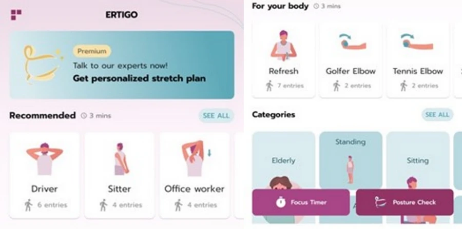 ERTIGO App Interface showing recommended exercises to address Office Syndrome