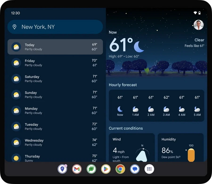 จะแสดงทั้งการคาดการณ์ออกมาเป็นรายชั่วโมง พารามิเตอร์ลม ระดับความชื้น และข้อมูลอื่นๆ โดยเมื่อกางหน้าจอออกมานี้จะช่วยให้ผู้ใช้งานเห็นภาพรวมของสภาพอากาศในสัปดาห์นั้นๆ ในขณะเดียวกันยังได้รายละเอียดเพิ่มเติมอีกด้วยเช่น เวลาไหนที่จะต้องใช้ร่มสำหรับการออกไปเที่ยวในเวลากลางคืน