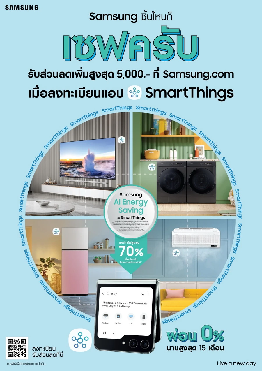 ซัมซุงพลิกโฉมมาตรฐานเครื่องใช้ไฟฟ้า ต้องคุณภาพเป็นหนึ่งพร้อมช่วย เซฟค่าไฟ ชวนคนไทยจัดการค่าไฟอย่างอยู่หมัดกับแคมเปญ “เซฟครับ - เซฟค่าไฟ เซฟเงินให้คุณ ด้วยแอป SmartThings” ด้วยผลิตภัณฑ์ซัมซุงที่มีเทคโนโลยี AI Energy Saving ผสานกับ SmartThings แพลตฟอร์มอัจฉริยะ ช่วยเชื่อมต่อชีวิตให้สุดสมาร์ท ประหยัดไฟสูงสูด 70% ถึง 4,000 บาทต่อปี แต่ยังคงทำงานได้อย่างเต็มประสิทธิภาพและทรงพลัง โดยในหมวดเครื่องปรับอากาศ จะมีการลดรอบปั่น compressor แต่คงความเย็นในห้องเท่าเดิม ทำให้ประหยัดไฟได้ถึง 2,616 บาทต่อปี