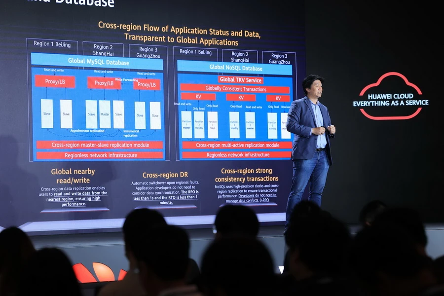 1. สถาปัตยกรรมแบบไร้ขอบเขต (Regionless Architecture) ฟีเจอร์ที่จะทำให้ทุกคนสามารถเข้าถึงและใช้บริการเทคโนโลยีคลาวด์ได้แม้จะไม่ใช่ผู้เชี่ยวชาญด้านเทคโนโลยี อีกทั้งยังสามารถใช้บริการคลาวด์ได้จากพื้นที่ทั้งภายในประเทศไทยหรือต่างประเทศ โดยเราเรียกเทคโนโลยีคลาวด์นี้ว่า Global Cloud Resource Orchestration & Scheduling (GOS) ซึ่งจะช่วยสร้างประสบการณ์การใช้งานที่ล้ำสมัยกว่าเดิมและมีประสิทธิภาพสูงขึ้น หากองค์กรต้องการช่วยอนุรักษ์สิ่งแวดล้อมหรือเน้นเรื่องความยั่งยืน (Go Green) หัวเว่ยก็สามารถช่วยกำหนดได้ว่าเราควรจะใช้เทคโนโลยีหรือวิธีการใดที่จะมาช่วยลดผลกระทบกับทรัพยากรได้อย่างมีประสิทธิภาพสูงสุด ลดต้นทุนค่าใช้จ่ายเรื่องโครงข่าย และยังช่วยจัดระเบียบศูนย์ข้อมูล (Data Center) ให้ลูกค้าสามารถปรับเปลี่ยนหรือโยกย้ายได้ตามต้องการ ในส่วนของแอปพลิเคชัน หัวเว่ยยังมีฟีเจอร์ Ubiquitous Cloud Native Service (UCS) ที่จะช่วยจัดการระบบคลาวด์ทุกรูปแบบ ไม่ว่าจะเป็นคลาวด์สาธารณะ (Public Cloud) คลาวด์ส่วนตัว (Private Cloud) หรือไฮบริดคลาวด์ (Hybrid Cloud) โดยมีจุดเด่นในเรื่องที่สามารถเคลื่อนย้ายข้อมูลไปยังภูมิภาคต่าง ๆ ทั่วโลกได้โดยใช้เวลาไม่ถึงนาที มอบอิสระในการกระจายบริการไปยังประเทศต่าง ๆ ทำให้ลูกค้าสามารถเข้าถึงข้อมูลได้อย่างรวดเร็วจากที่ไหนก็ได้ อีกทั้งยังมีค่าความหน่วง (Latency) ที่ต่ำอีกด้วย