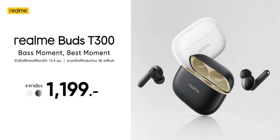 นอกจากนี้ภายในงาน realme ยังได้เปิดตัว realme Buds T300 หูฟังไร้สายที่อัดแน่นไปด้วยเทคโนโลยีที่ล้ำหน้าเหมาะกับไลฟ์สไตล์ของคนรุ่นใหม่ในทุกรูปแบบ ไม่ว่าจะเป็น Dynamic Bass Driver ขนาด 12.4mm ซึ่งไดรเวอร์ขนาดใหญ่นี้จะช่วยให้ได้รับเสียงเบสที่เต็มอิ่ม สนามเสียงที่ไพเราะและเสียงร้องที่ชัดเจน พร้อมรองรับการตัดเสียงรบกวนแบบแอคทีฟสูงสุด 30dB ด้วยเทคโนโลยี ANC Noise Cancellation ที่จะช่วยให้ได้รับอรรถรสที่เต็มอิ่มในโลกของคุณได้ตลอดเวลาแม้จะอยู่ในสภาพแวดล้อมที่มีเสียงดัง และยังมอบดีไซน์ที่เพรียวบางและมีสไตล์ พร้อมการออกแบบตามหลักสรีรศาสตร์เพื่อให้พอดีกับรูปทรงหูที่แตกต่างกัน ไม่เพียงเท่านั้นยังมอบประสิทธิภาพด้วยการกันน้ำระดับ IP55 ให้คุณใช้งานได้อย่างไร้ความกังวล