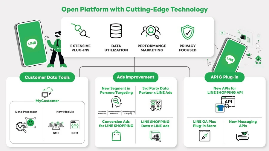 2. Ads Improvement ปรับปรุงเครื่องมือสำหรับการโฆษณาบน LINE ให้สามารถวิเคราะห์ ประยุกต์ใช้ข้อมูลที่แบรนด์ได้มาเพื่อขับเคลื่อนการเติบโตของธุรกิจได้ดียิ่งขึ้น อาทิ การเพิ่ม Segment ในการหากลุ่มเป้าหมายผ่าน Persona Targeting ให้เฉพาะเจาะจงมากยิ่งขึ้น และการเปิดให้ภาคธุรกิจ ร้านค้า สามารถนำข้อมูลพฤติกรรมผู้บริโภคบน LINE SHOPPING มาวิเคราะห์แบ่งกลุ่ม เพื่อการยิงโฆษณาผ่าน LINE ADS ได้แม่นยำและครอบคลุมขึ้นกว่าเดิม เป็นต้น