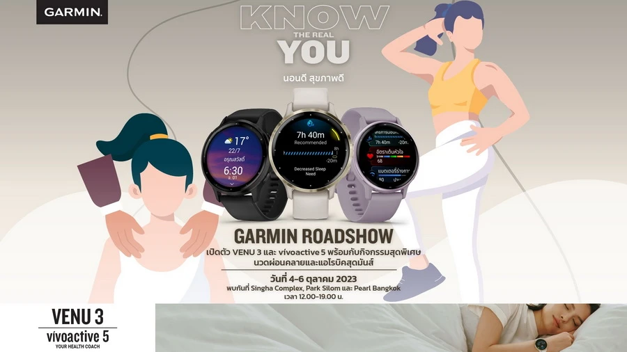หลังจากที่ได้เปิดตัวสินค้ากลุ่มเวลเนสซีรีย์ของปี 2023 ครบถ้วน Garmin จึงอยากเชิญชวนให้ทุกคนได้เข้ามาสัมผัสกับสินค้าตัวจริง ไม่ว่าจะเป็นตัว VENU 3 หรือ VIVOACTIVE 5 จึงได้จัดขบวนโรดโชว์ KNOW THE REAL YOU ที่จะนำสีสัน ความสนุก และความผ่อนคลายมาให้กับชาวออฟฟิศ ประกอบด้วยกิจกรรมมากมายที่ให้ผู้เข้าร่วมได้ลองสัมผัส ไม่ว่าจะเป็นช่วงเวลาแห่งความแอคทีฟ กับกิจกรรมแอโรบิคสุดมันส์ และช่วงเวลาแห่งความผ่อนคลาย กับโซนนวดผ่อนคลายประกอบการทำสมาธิ ที่จะช่วยบาลานซ์ให้สุขภาพ รวมถึงการนอนของคุณดี ถ่ายทอดอย่างลึกซึ้งถึงประสบการณ์จริงที่ทุกคนจะได้สัมผัส เมื่อได้ทดลองสวมใส่ Garmin สมาร์ทวอทช์กลุ่มเวลเนสทั้งในรุ่น VENU 3 และ VIVOACTIVE 5 ทางเลือกของคนรักสุขภาพ โดยขบวนโรดโชว์จะมีทั้งหมด 3 วันเริ่มตั้งแต่วันที่ 4 - 6 ตุลาคม เวลา 12.00 – 19.00 น. ออกสร้างสีสันให้กับชาวออฟฟิศอย่างทั่วถึง เพื่อทำให้ชีวิตชาวออฟฟิศไม่น่าเบื่ออีกต่อไปเมื่อมี Garmin โดยวันที่ 1 จะหยุดที่ ตึกสิงห์ คอมเพล็กซ์ วันที่ 2 จะหยุดที่ พาร์ค สีลม และวันที่ 3 จะจบลงที่เพิร์ล แบงก์ค็อก”