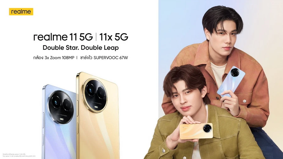 ในครั้งนี้เรียลมีเปิดตัวพร้อมกัน 2 รุ่น ซึ่งมีความโดดเด่นในตัวเองทั้งคู่ โดยใน realme 11 5G มาพร้อมกล้อง 108MP และการชาร์จไว SUPERVOOC 67W ซึ่งถือว่าเป็นสเปคที่ดี 2 เท่าในมาตรฐานสมาร์ตโฟนในระดับราคาเดียวกัน และเพื่อให้คนรุ่นใหม่ได้สัมผัสประสบการณ์อันก้าวกระโดดในราคาที่เอื้อมถึงได้จึงทำให้ realme 11x 5G เป็นสมาร์ตโฟนที่ดีที่สุดในระดับราคาเดียวกัน โดยมาพร้อมกล้อง 64MP ที่มีพิกเซลที่ดีที่สุดและการชาร์จไว SUPERVOOC 33W และ RAM 8GB ขนาดใหญ่ที่สุดในระดับเซกเมนต์เดียวกันและนอกจากเรียลมีจะเป็นผู้นำเทคโนโลยีที่ต้องการมอบประสบการณ์อันก้าวกระโดดจาก realme 11 5G และ realme 11x 5G แล้วเรียลมียังคงมุ่งมั่นที่จะมอบประสบการณ์ที่ก้าวกระโดดให้กับคนรุ่นใหม่ จึงดึงสองพรีเซนเตอร์ “ปอนด์-ณราวิชญ์ เลิศรัตน์โกสุมภ์” และ “ภูวินทร์ ตั้งศักดิ์ยืน” ผู้เป็นไอคอนของคนรุ่นใหม่ โดยสำหรับหนุ่มปอนด์ ถือเป็นผู้ชนะเลิศจากการประกวดค้นหานักแสดงหน้าใหม่และหนุ่มภูวินทร์ยังได้รับรางวัลนักแสดงหน้าใหม่ดีเด่นและด้วยความเพอร์เฟกต์และสมบูรณ์แบบอีกทั้งยังประสบความสำเร็จในเวลาอันรวดเร็วจึงเข้ากับเรียลมี และความโดดเด่นในตัวเองของสมาร์ตโฟนทั้งสองรุ่นนั้นเปรียบเสมือนกับหนุ่มปอนด์และภูวินทร์ที่มีไลฟ์สไตล์ที่ต่างกันแต่ก็มีความเข้ากันเป็นอย่างดี นับว่าแมทซ์เข้ากับความ Double Star ได้อย่างลงตัว