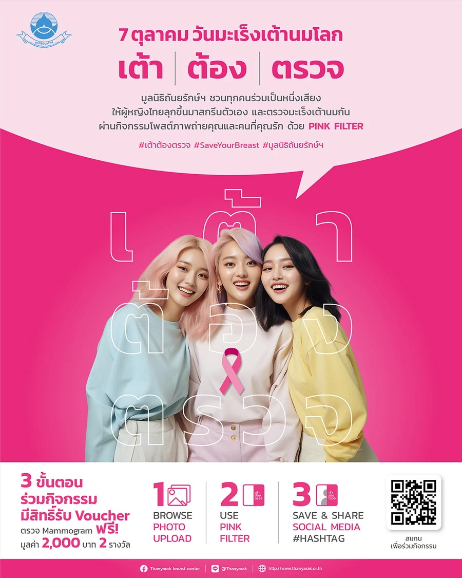 เพราะโรคมะเร็งเต้านมเป็นภัยเงียบอันดับ 1 ของผู้หญิงทั่วโลก มีผู้เสียชีวิตด้วยโรคนี้ถึงปีละมากกว่า 600,000 คน และมีสถิติตรวจพบในผู้หญิงที่มีอายุน้อยเป็นโรคนี้จำนวนมากขึ้น เพราะการป้องกันที่ดีที่สุด คือการค้นพบให้เร็วที่สุด ยิ่งตรวจเจอไว ยิ่งรักษาได้เร็ว พร้อมกันนี้ขอเชิญชวนแฟนๆ สโมสร ทรู แบงค็อก ยูไนเต็ด และคนไทยทุกคน ร่วมกิจกรรม "เต้า ต้อง ตรวจ Pink Filter" ที่ : https://www.thanyarak.or.th/saveyourbreast มีสิทธิ์รับ Voucher ตรวจแมมโมแกรมฟรี! ดูรายละเอียดเพิ่มเติมได้ที่ https://www.facebook.com/thanyarakbreastcenter
