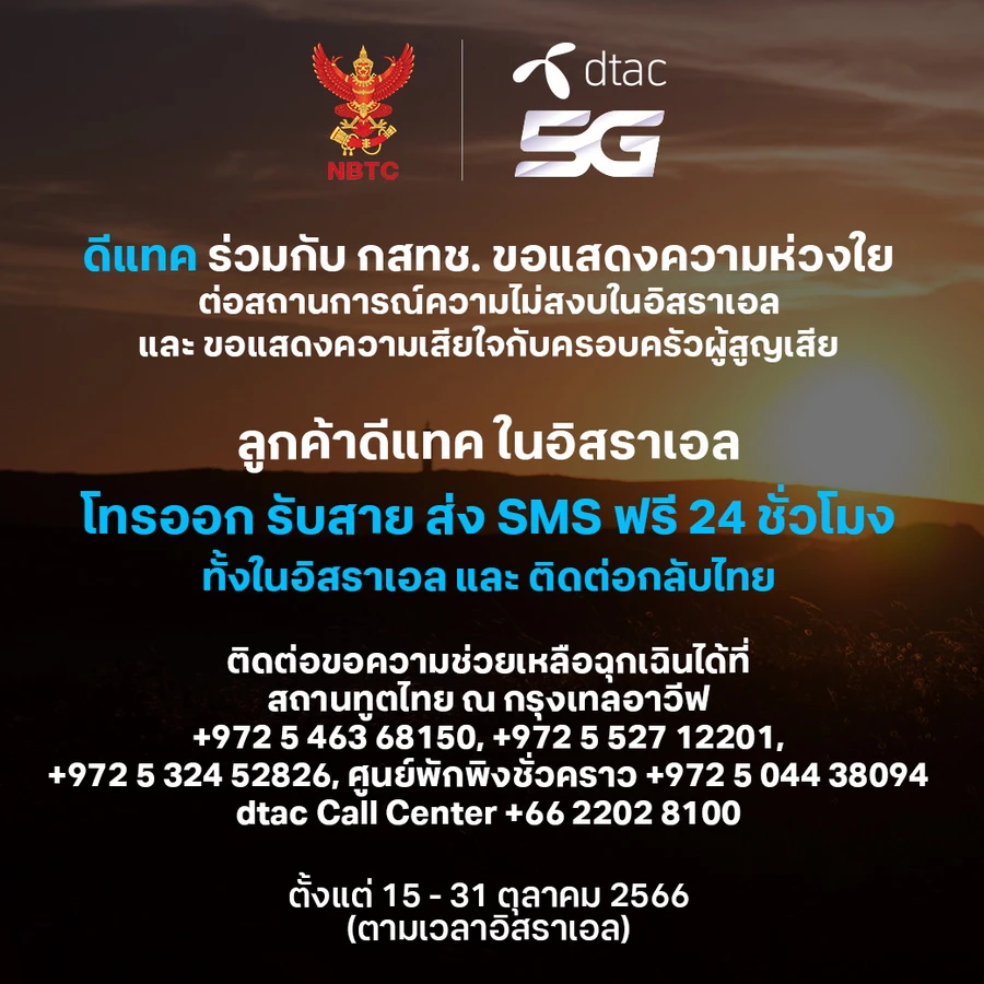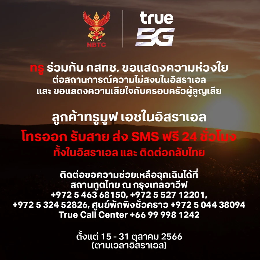 เพราะกำลังใจและความปลอดภัยสำคัญที่สุด ทรู คอร์ปอเรชั่น จึงจัดเต็มภารกิจสนับสนุนการสื่อสาร เปิดระบบให้ลูกค้าทรูมูฟ เอช และดีแทค ที่อิสราเอล โทรและ SMS ฟรีทั้งภายในอิสราเอล และฟรีกลับมายังครอบครัวในประเทศไทย ตลอด 24 ชม. ตั้งแต่วันนี้ ถึง 31 ตุลาคมนี้ เพิ่มเติมจากมาตรการเร่งด่วนขั้นต้นที่อำนวยความสะดวกให้ลูกค้าทรูมูฟ เอช และดีแทคที่ใช้บริการโรมมิ่งอยู่ในอิสราเอล สามารถโทรติดต่อและขอความช่วยเหลือฉุกเฉินจากสถานทูตไทย ณ กรุงเทลอาวีฟ และ Call Center ทั้งทรูและดีแทคได้ฟรี มาตั้งแต่ 7 ตุลาคมที่ผ่านมา อีกทั้งยังพร้อมเป็นสื่อกลางส่งข้อมูลข่าวสารผ่าน SMS Broadcast เพื่อให้ลูกค้าที่อยู่ในอิสราเอลได้รับทราบข้อมูลและความเคลื่อนไหวที่เป็นประโยชน์และมีความจำเป็นสำหรับการตัดสินใจเพื่อความปลอดภัยในสวัสดิภาพของผู้อยู่ในพื้นที่