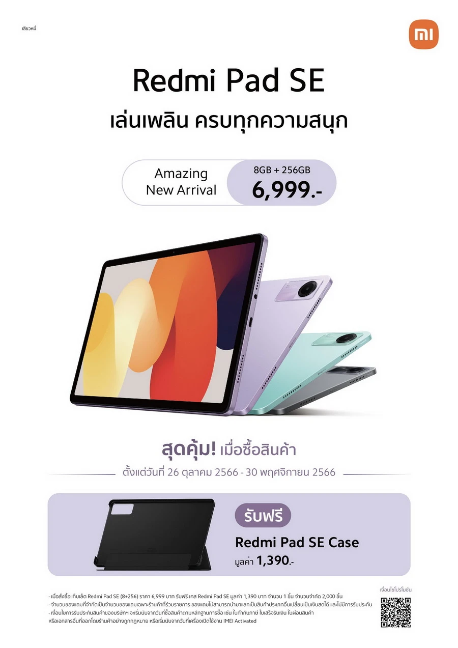 พิเศษ! สำหรับลูกค้าที่ซื้อ Redmi Pad SE รุ่นความจุ 8GB+256GB ในระหว่างวันที่ 26 ตุลาคม 2566 - 30 พฤศจิกายน 2566 รับฟรี! Redmi Pad SE Case มูลค่า 1,390 บาท!