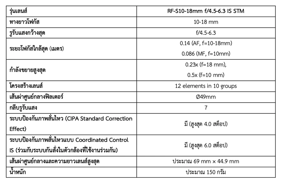 ข้อมูลเชิงเทคนิคของ RF-S10-18mm f/4.5-6.3 IS STM