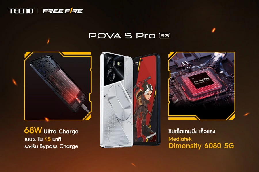 POVA 5 Pro 5G ชาร์จไวไม่ร้อนมือ 68W Ultra Charge ชาร์จไวความเร็วสูงที่สุดใน POVA Series ชาร์จ 100% ภายใน 45 นาที รองรับ Bypass Charge การชาร์จแบบไม่ผ่านแบตเตอรี่ช่วยถนอมอายุของแบตเตอรี่ให้ยาวนานมากยิ่งขึ้น ปลอดภัยไม่ลัดวงจร ดังนั้นก็สามารถเล่นไปชาร์จไปได้อย่างไร้กังวล ขับเคลื่อนด้วยขุมพลัง Dimensity 6080 ชิปเซ็ตเกมมิ่งจาก MediaTek สามารถประมวลผลได้อย่างรวดเร็วด้วยสถาปัตยกรรมขนาด 6 นาโนเมตร ทำให้เวลาใช้งานหนัก ๆ พร้อมกันหลายแอปฯ ไม่ว่าจะเล่นเกม รับชมคอนเทนต์ สตรีมมิ่ง ก็ไม่เกิดอาการเครื่องช้าหรือหน่วง POVA 5 Pro ที่รองรับ 5G ช่วยให้เข้าถึงความเร็วได้ทุกที่ไม่ว่าจะอยู่นอกบ้าน ระหว่างการเดินทางก็พร้อมเข้าถึงความบันเทิงได้ตลอดเวลา