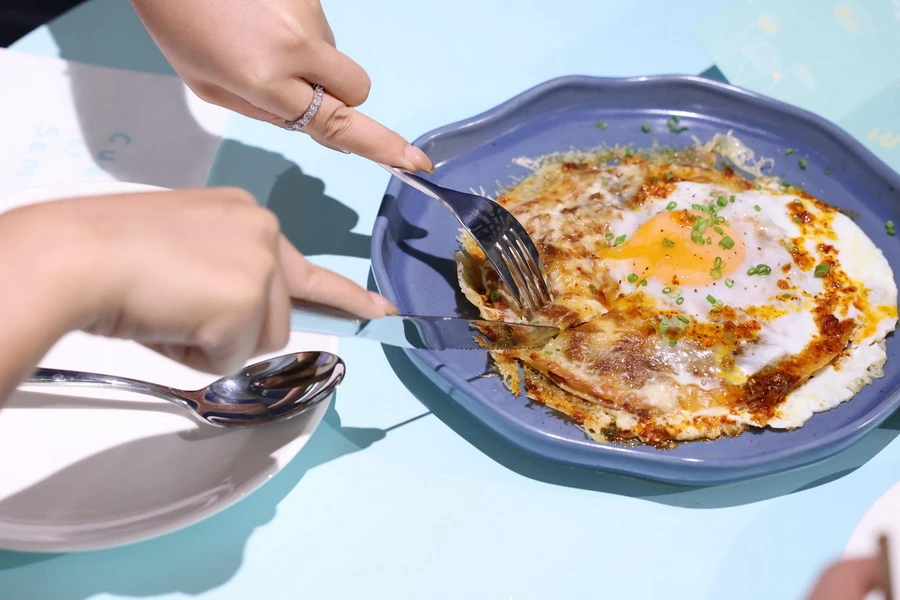 ♦ Brie & Egg tortillas เมนูอาหารคาว แผ่นแป้งข้าวโพดเม็กซิกัน ท็อปด้วยไข่และ Brie Cheese ราดซอสเบคอน ผสม Chili oil และหมาล่า สไตล์ Asian twist เป็นเมนูพิเศษเฉพาะที่ Cup of Sam เท่านั้น