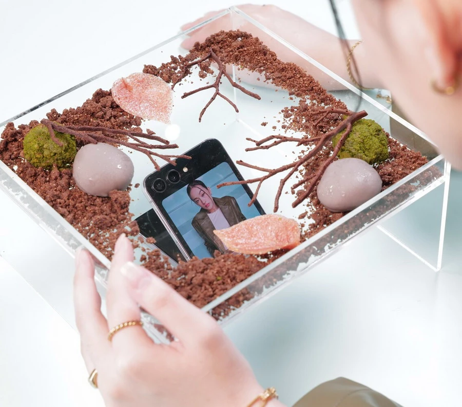 ♦ Experience the Flip side ที่ได้รับแรงบันดาลใจมากจาก Samsung Galaxy Z Flip5 ด้วยส่วนผสมที่หลากหลายอย่างเอิร์ลเกรย์มิลค์ ฮาเซลนัท และชอคโกแลต ในรูปทรงเลียนแบบธรรมชาติทั้งดิน กิ่งไม้ และใบไม้ ได้อย่างสวยงาม ซึ่งเชฟ Kenneth ได้ผสมผสานความเป็นธรรมชาติและอินโนเวชันเข้าด้วยกัน ออกมาเป็นขนมหวานแสนงดงามที่ทุกคนสามารถ Interact และถ่ายภาพสุดครีเอทีฟโพสต์ลงโซเชียลมีเดีย