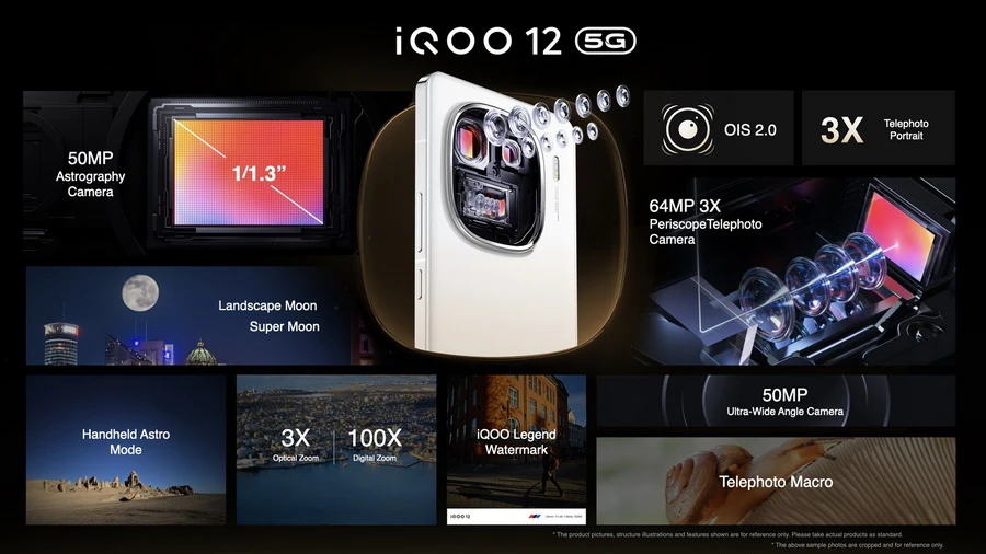 ผู้ใช้งาน iQOO 12 5G สามารถใช้การซูมแบบ Ultra-Long ผ่านกล้อง Periscope Telephoto พร้อมกล้องความละเอียด 64MP (f/2.57) และเซนเซอร์ขนาด ½ นิ้ว ซูม Optical ได้ถึง 3 และ 10 เท่า เสริมด้วยการซูมดิจิทัลสูงสุด 100 เท่าด้วยอัลกอริทึม N.I.C.E. (Neural Image Computational Engine) อัลกอริทึมประมวลผลภาพที่ถูกใช้งานโดยกล้องถ่ายภาพดาราศาสตร์ระดับไฮเอนด์ (High-End) ภาพที่ถ่ายจะถูกสร้างขึ้นใหม่โดยใช้ AI ในการลดนอยซ์และเพิ่มรายละเอียด นอกจากนี้ยังมีอัลกอริทึม Ultra HD Document 3.0 ที่ทำงานผสานกับเลนส์ระยะไกลเพื่อผลลัพธ์ภาพถ่ายที่คมชัดทุกครั้งที่กดชัตเตอร์