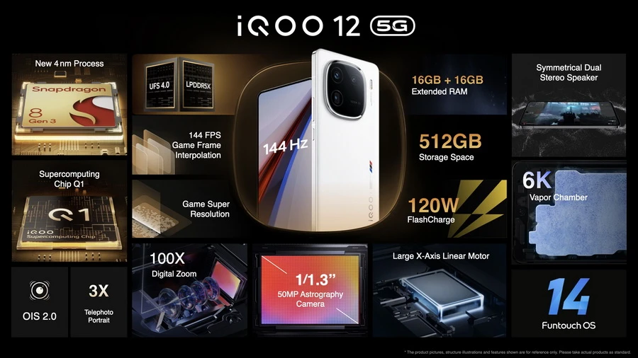 ชิปประมวลผลแนวหน้าอย่าง Snapdragon® 8 Gen 3 ผสานกับชิป Supercomputing Q1 ที่ iQOO ปรับแต่งขึ้นเป็นพิเศษ และดีไซน์ Porthole อันเป็นเอกลักษณ์ เสริมด้วยจิตวิญญาณนักแข่งที่เปี่ยมไปด้วยความมุ่งมั่นของ BWM M Motorsport ทำให้ iQOO 12 5G มีความทรงพลังทั้งประสิทธิภาพภายในและรูปลักษณ์ภายนอก ตลอดจนสามารถก้าวข้ามทุกขีดจำกัดของประสบการณ์การเล่นเกมบนสมาร์ตโฟนได้”