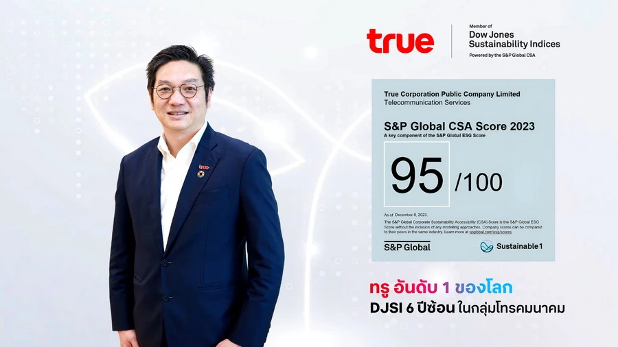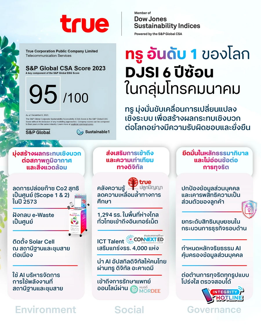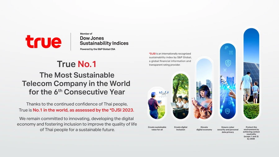 ทรู คอร์ปอเรชั่น เทเลคอม เทคคอมปานีไทย คว้าดัชนีความยั่งยืนระดับเวิลด์คลาส Dow Jones Sustainability Indices (DJSI) ปี 2023 ด้วยคะแนนสูงสุด ในกลุ่มโทรคมนาคมของโลกต่อเนื่องเป็นปีที่ 6 ตามประกาศของ S&P Global เมื่อ 8 ธันวาคม 2566 ด้วยยุทธศาสตร์สร้างการเปลี่ยนแปลงเชิงระบบทุกมิติ ชูนวัตกรรมปัญญาประดิษฐ์ เพิ่มประสิทธิภาพธุรกิจ ลดการใช้พลังงาน เสริมทักษะดิจิทัล นำศักยภาพเทคโนโลยีดิจิทัลลดความเหลื่อมล้ำด้านการศึกษา พร้อมขยายผลกระบวนการธุรกิจที่เคารพสิทธิมนุษยชนตลอดห่วงโซ่อุปทาน หนุนธรรมภิบาลเอไอ โปร่งใส ตรวจสอบได้ และต่อต้านการทุจริตทุกรูปแบบ โดยทรู ยังคงมุ่งมั่นดำเนินธุรกิจบนพื้นฐานความยั่งยืน เดินหน้าสร้างคุณค่าระยะยาว ร่วมยกระดับคุณภาพชีวิตคนในสังคม และขับเคลื่อนธุรกิจให้เติบโต พร้อมเปลี่ยนผ่านประเทศไทยสู่เศรษฐกิจดิจิทัล