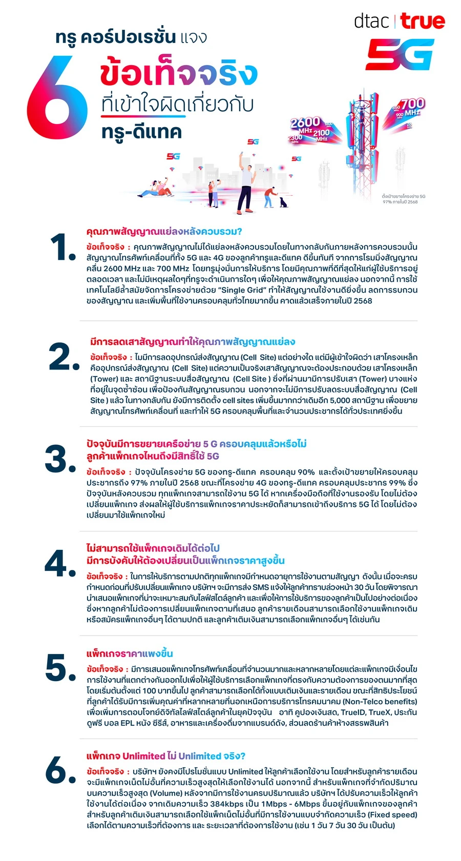 ข้อเท็จจริง : ปัจจุบันโครงข่าย 5G ของทรู-ดีแทคครอบคลุม 90% และตั้งเป้าขยายให้ครอบคลุมประชากรถึง 97% ภายในปี 2568 ขณะที่โครงข่าย 4G ของทรู-ดีแทค ครอบคลุมประชากร 99% ซึ่งปัจจุบันหลังควบรวม ทุกแพ็กเกจสามารถใช้งาน 5G ได้ หากเครื่องมือถือที่ใช้งานรองรับ โดยไม่ต้องเปลี่ยนแพ็กเกจ ส่งผลให้ผู้ใช้บริการแพ็กเกจราคาประหยัดก็สามารถเข้าถึงบริการ 5G ได้ โดยไม่ต้องเปลี่ยนมาใช้แพ็กเกจใหม่