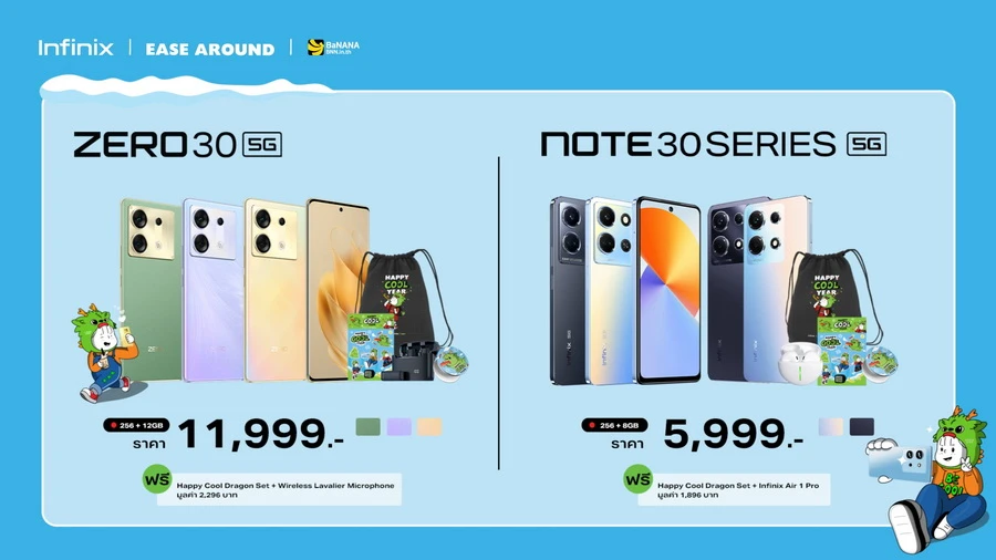 อินฟินิกซ์ (Infinix) แบรนด์สมาร์ตโฟนราคาคุ้มค่า ครบครันทุกการใช้งาน และตอบโจทย์ไลฟ์สไตล์คนรุ่นใหม่ ส่งมอบความพิเศษส่งท้ายปีเก่าต้อนรับปีใหม่ จับมือ Ease Around ออกแบบ คอลเล็กชันสุดคลู Happy Cool Dragon Year เพื่อมอบเป็นของขวัญพิเศษให้กับผู้ที่ซื้อมือถือ Infinix โดยมีมือถือ 3 รุ่น ตัวปัง ที่ร่วมจัดโปรโมชัน ได้แก่ ZERO 30 5G, NOTE 30 5G และ NOTE 30 4G สามารถซื้อสินค้าและรับของแถมสุดเอ็กซ์คลูซีฟได้ที่ร้าน BaNANA ตั้งแต่วันที่ 23 ธันวาคม 2566 เป็นต้นไป