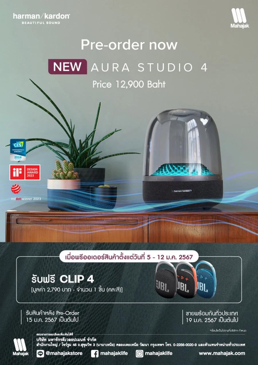 พิเศษสำหรับลูกค้าที่ทำการสั่งซื้อ Harman/Kardon AURA STUDIO 4 ล่วงหน้า (ระหว่างวันที่ 5 ม.ค. 67 – 12 ม.ค. 67) รับฟรี!! JBL Clip 4 จำนวน 1 ตัว (มูลค่า 2,790 บาท) Shop Online ได้ที่ >> https://www.mahajak.com/th/aura-studio-4.html