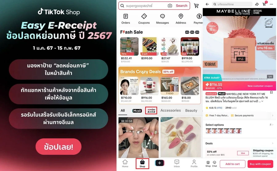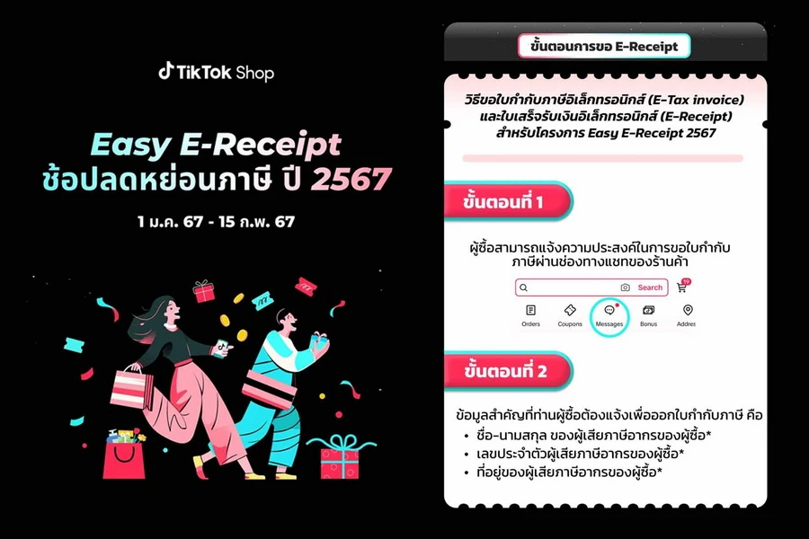 TikTok Shop โซลูชันอีคอมเมิร์ซครบวงจรบนแพลตฟอร์ม TikTok ร่วมสนับสนุนผู้ค้ารายย่อยและผู้บริโภคกับโครงการ “Easy E-Receipt” เพื่อกระตุ้นเศรษฐกิจและการใช้จ่ายในตลาดอีคอมเมิร์ซช่วงต้นปี 2567 จัดหมวด "ลดหย่อนภาษี" โดยรวบรวมสินค้าและร้านค้าที่เข้าร่วมโครงการฯ กว่า 200 ร้านค้า อาทิ Central Department Store, Big C, Dyson Thailand, IT City, Supersports Thailand อำนวยความสะดวกให้ผู้บริโภคได้เลือกซื้อสินค้าที่ต้องการพร้อมขอรับใบกำกับภาษีอิเล็กทรอนิกส์ (e-Tax Invoice) หรือใบเสร็จรับเงินอิเล็กทรอนิกส์ (e-Receipt) ได้สะดวก รวดเร็ว ผ่านหน้า Chat ของร้านค้า ลดภาระการดำเนินการด้านภาษีให้แก่ผู้บริโภคและส่งเสริมการชำระเงินแบบดิจิทัล